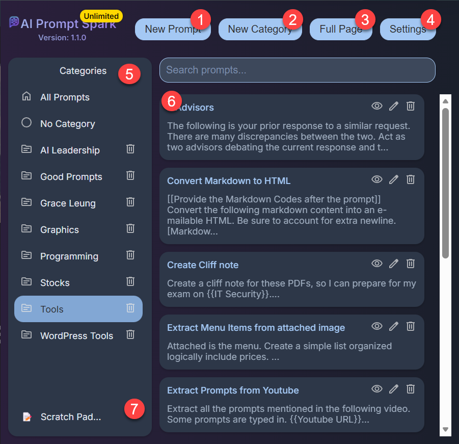- Categorize prompts and manage categories